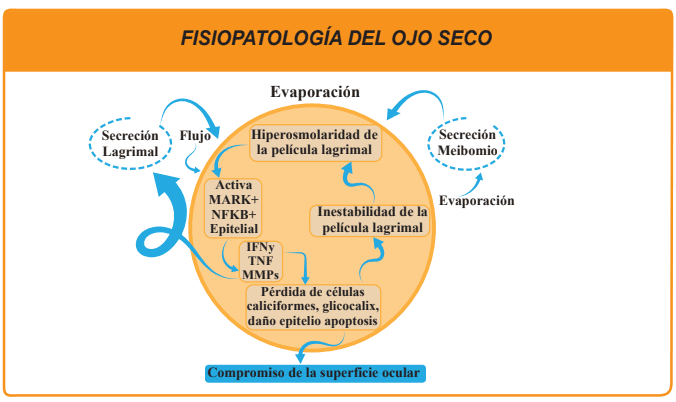 Fisiopatológicamente, cuando hay una agresión o noxa, que puede ser de origen ambiental, infeccioso, endógeno o genético, se produce una respuesta inflamatoria mediada por citoquinas y metilproteinasas que inducen la proliferación de linfocitos que, a su vez, infiltran la superficie ocular y la glándula lagrimal principal, resulta así una exacerbación del proceso inflamatorio y daño de la superficie ocular que, a su vez, potencia la respuesta inflamatoria que origina un círculo vicioso.
