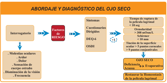 Se puede recurrir a pruebas más sofisticadas que persiguen medir la osmolaridad. El tratamiento del ojo seco, se determina de acuerdo a la severidad del mismo. En los casos leves, se realizan modificaciones en el medio local, posibles cambios dietéticos con suplementos de ácidos, identificación y modificaciones de medicamentos tópicos o sistémicos, lubricantes oculares tópicos, higiene palpebral y compresas tibias.