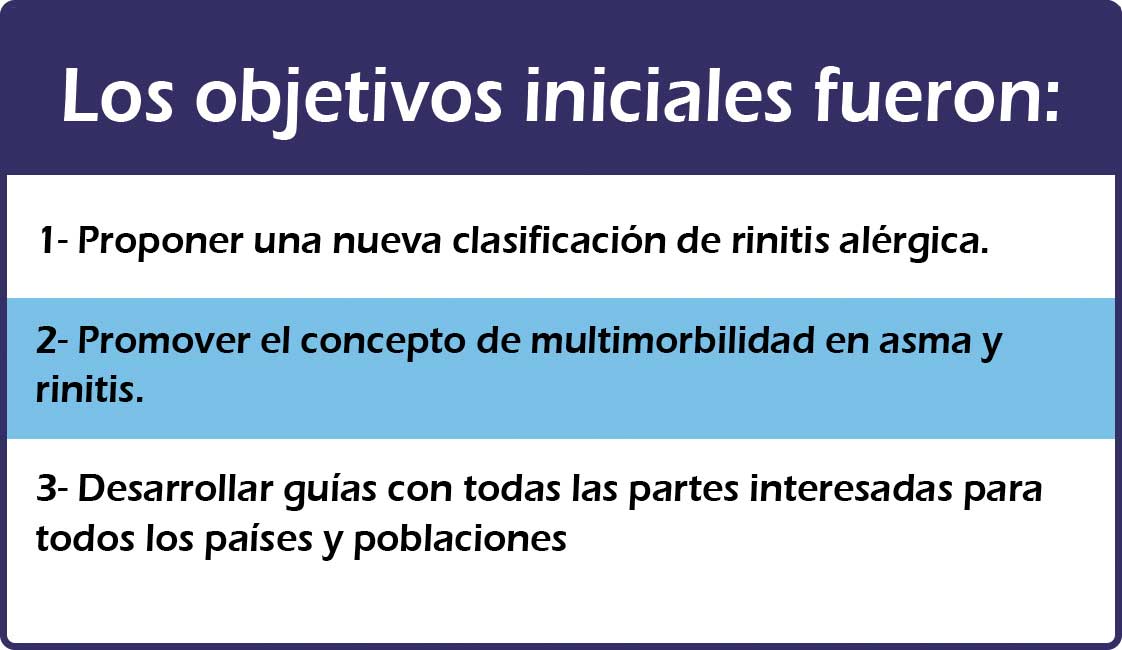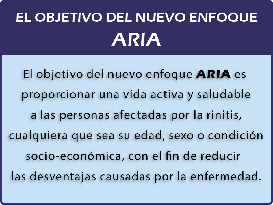 Los objetivos iniciales fueron proponer una nueva clasificación de rinitis alérgica, promover el concepto de multimorbilidad en asma y rinitis y desarrollar guías con todas las partes interesadas para todos los países y poblaciones. ARIA, difundida y puesta en marcha en más de 70 naciones, ahora se centra en la activación de tecnologías emergentes para la medicina individualizada y predictiva. La clasificación sugerida, aún sigue vigente. Por su facilidad de uso por cualquier médico general o especialista que vea problemas de índole alérgico respiratorio de vías superiores.