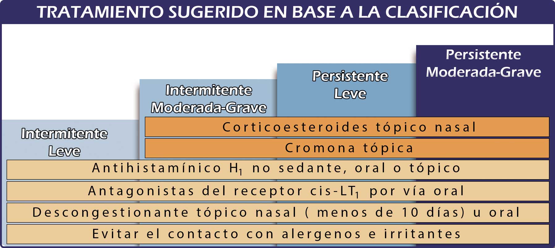 Los corticoides intranasales y la combinación de corticoides intranasales más antihistamínicos orales pueden usarse indistintamente en la RA estacional, aunque se prefieren los corticoides intranasales solos en la RA persistente.