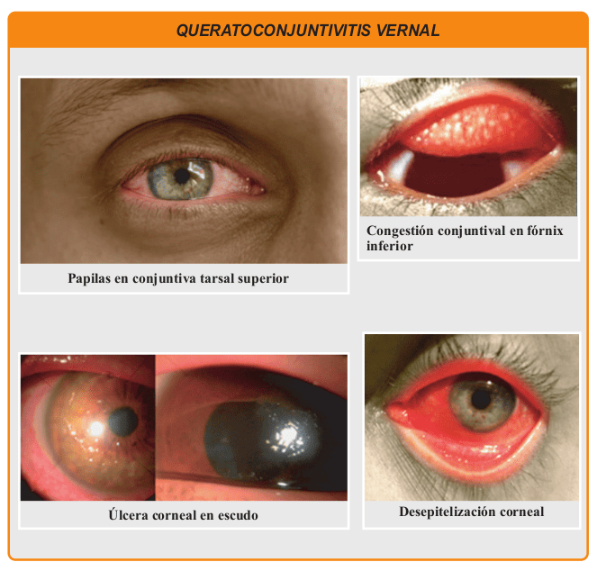 Luego, dos categorías más que se denominan queratoconjuntivitis vernal, la cual se caracteriza por el desarrollo de papilas gigantes en la conjuntiva tarsal que afectan mayormente a varones en las dos primeras décadas de la vida, y pueden presentar nódulos de Trantas que corresponden a infiltrados limbares de linfocitos y complicarse con lesiones epiteliales y úlcera en escudo y, por último, la queratoconjuntivitis atópica.