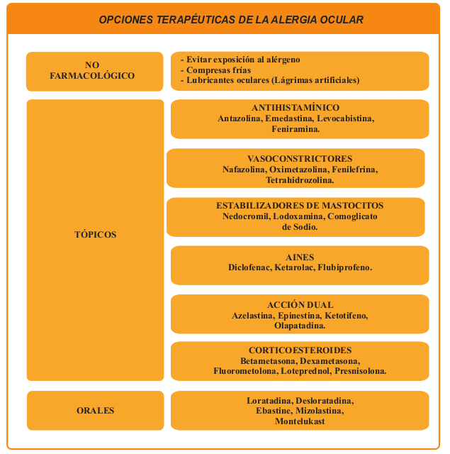 Los descongestionantes y antiinflamatorios no esteroideos pueden ser de ayuda. Como tercer eslabón, podemos hacer uso de los corticoesteroides, tomando en cuenta que deben usarse por tiempo limitado por sus efectos adversos como glaucoma y catarata cuando son empleados por largos períodos y en forma indiscriminada. También podemos usar inmunomoduladores como la ciclosporina y tacrolimus.