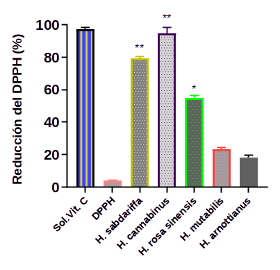 En la figura 1, se observa que los extractos de H. sabdariffa y H. cannabinus fueron los que presentaron el mayor porcentaje de reducción de DPPH, muy semejantes al control de ácido ascórbico (vitamina C). Así mismo el análisis estadístico arrojo diferencia estadística en la capacidad de reducción de estas tres especies respecto al control de no reducción (DPPH solo) Para los extractos de las otras especies, el porcentaje de reducción resultó ser el más bajo, lo que se asocia a su bajo contenido en compuestos antioxidantes.