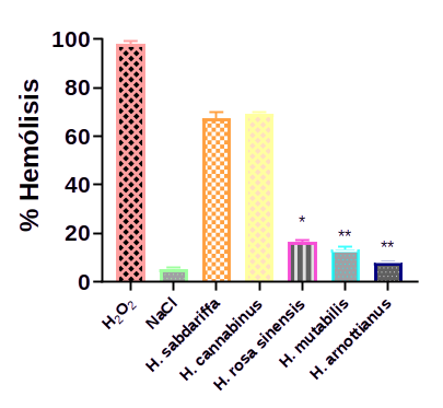 En la figura 2, se observa como los extractos acuosos de las especies H. sabdariffa y H. cannabinus presentaron un porcentaje de hemólisis significativamente mayor frente a las otras especies en estudio, en el orden del 70% de hemólisis. Para los extractos de las otras tres especies, el porcentaje de hemólisis estuvo por debajo del 20 %. El análisis estadístico arrojó que los porcentajes de las especies H. rosa-sinensis, H. mutabilis, H. arnotitanus fueron estadísticamente diferentes respecto al control de no hemolisis del Cloruro de sodio (NaCl).