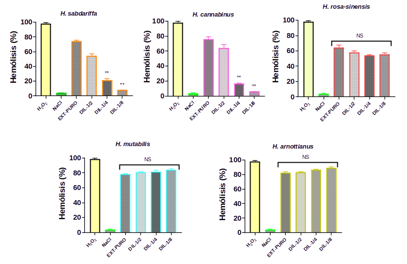 Los ensayos de la evaluación de la actividad antihemolítica de los extractos arrojaron que las especies H. sabdariffa y H cannabinus presentaron una mayor protección al emplearse diluidos 1/4 y 1/8, con diferencia estadística (**p < 0,05) respecto al control de hemólisis constituido por el H2O2. Para las especies H. rosa-sinensis, el porcentaje de inhibición estuvo alrededor del 60%, sin diferencia significativa (p > 0,05). Referente a las especies H. mutabiulisy H. arnottianus, no se observó inhibición significativa de la hemólisis (p > 0,05) (figura 3).