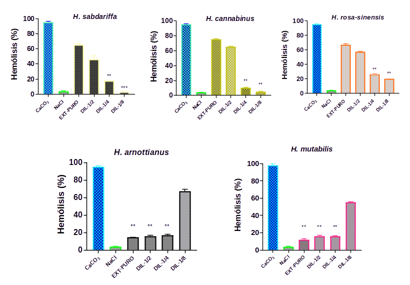 Figura 4. Actividad antihemolítica de los extractos en presencia de carbonato de calcio (CaCO3). H. sabdariffa dil ¼ **p = 0,017, dil 1/8 ***p = 0,008; H. cannabinus **p = 0,014-0,013; H. rosa-sinensis **p = 0,014-0,015; H. mutabilis y H. armottianus valore de **p alrededor de 0,010.