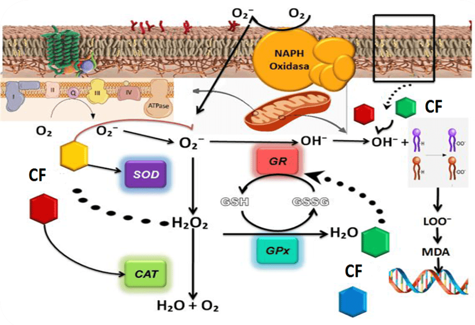 Figura 6. Efecto de los compuestos fenólicos (CF), a nivel intracelular. Súper oxido dismutasa (SDO), catalasa (CAT) y glutatión redactasa (GR). (Pacheco-Coello et al. 2021).