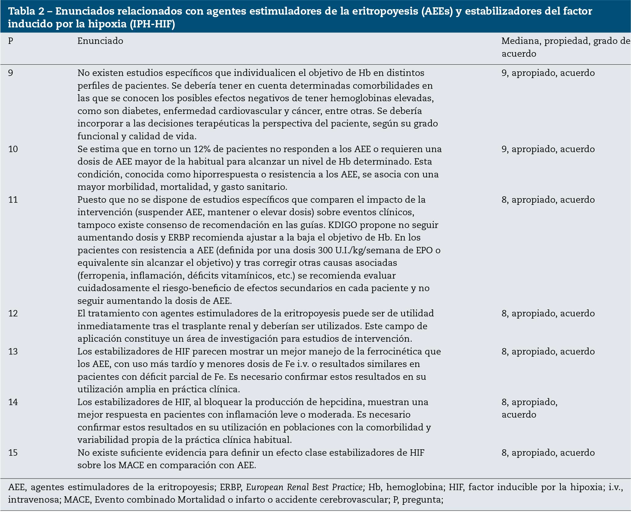 Por otro lado, la guía European Renal Best Practice (ERBP) indica que se debe indicar los AEE cuando la concentración de Hb es <10 g/dl en todos los pacientes con ERC, proponiendo una individualización tanto del inicio (más precoz en individuos activos de bajo riesgo) como de objetivos de Hb, aunque sin superar Hb de12 g/dl en ningún caso.