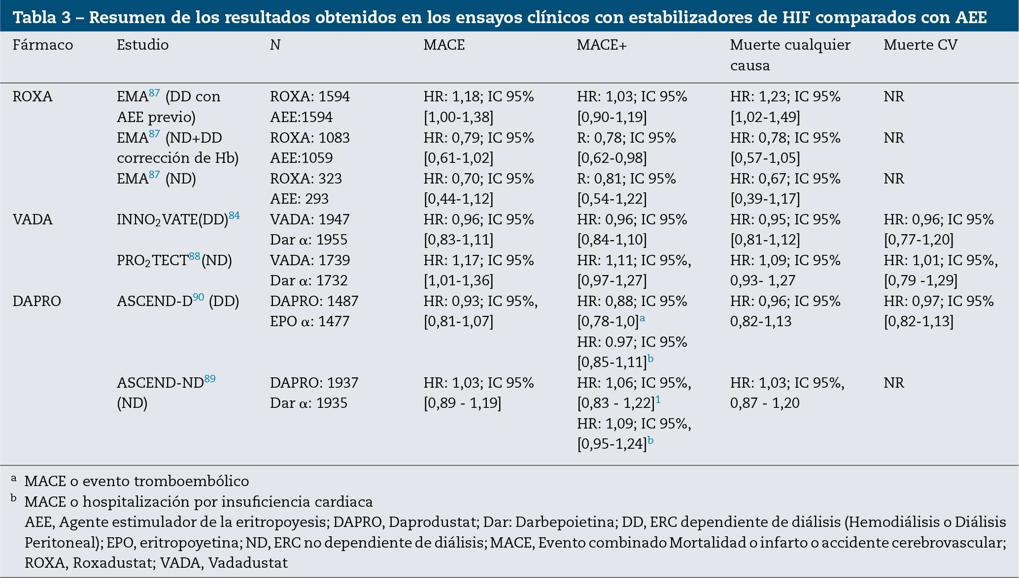 No existen estudios comparativos de seguridad CV entre los diferentes estabilizadores de HIF. La tabla 3 resume resultados en eventos CV de los distintos ensayos clínicos de los estabilizadores de HIF. Tras los resultados de los distintos ensayos clínicos y análisis por las agencias reguladoras84,87–90 se puede concluir que las distintas moléculas presentan un perfil con respecto a MACE de no inferioridad en aquellos pacientes DD, pero sus resultados en ND resultan más controvertidos. Este hecho justificaría la realización de más estudios para poder garantizar la seguridad de estas moléculas en todos los pacientes con ERC.