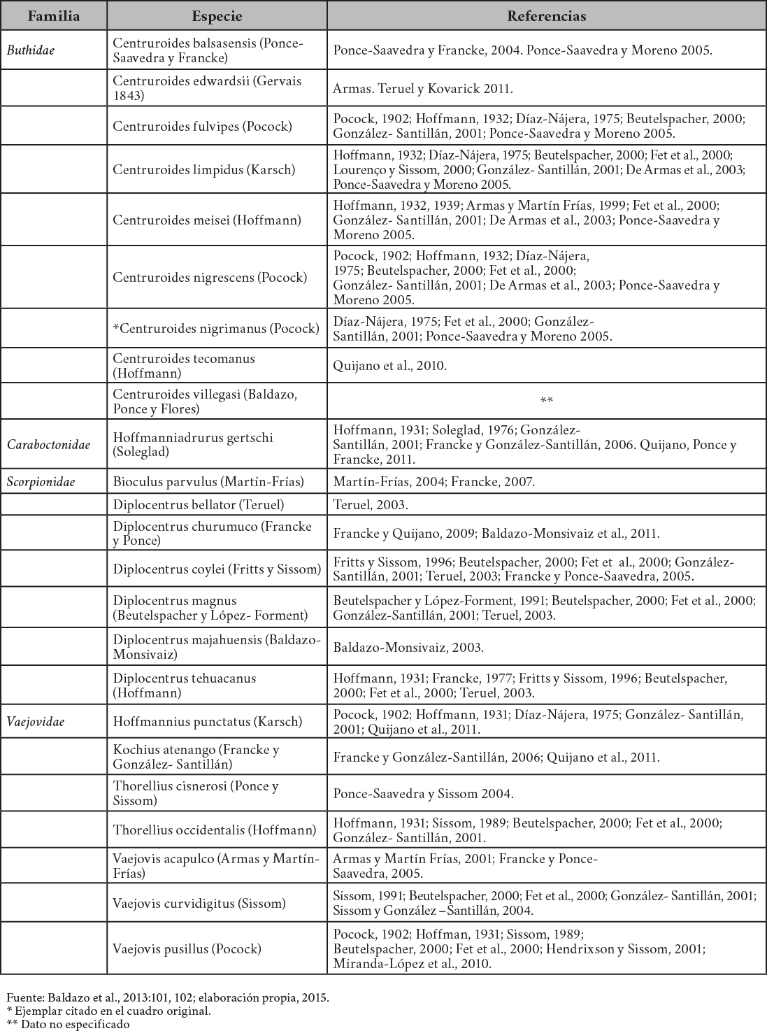 Baldazo Monsiváiz José Guadalupe, Ponce Saavedra Javier y Flores Moreno Miguel (2012). “Los alacranes (Arachnida: Scorpionida) de importancia médica del Estado de Guerrero, México”. En Dugesiana. México: Universidad de Guadalajara. Vol. 19. Número 2. 143-150.