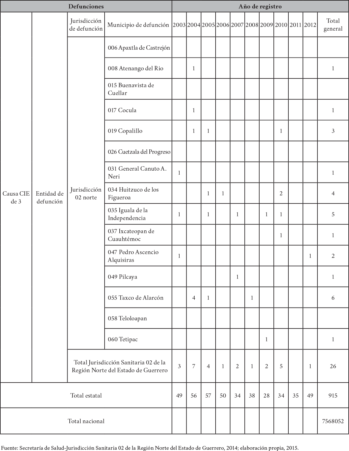 Se recopiló información sobre mortalidad para los municipios que conforman dicha región en el periodo que abarcó los años 2003 al 2012, así como también, los datos totales para el nivel estatal y nacional (Cuadro 2).