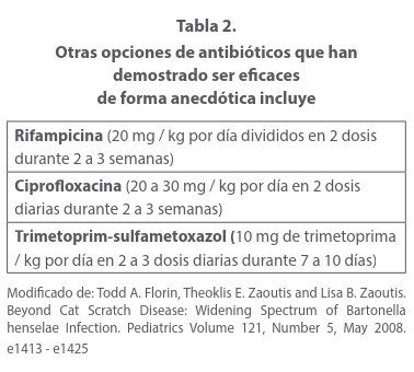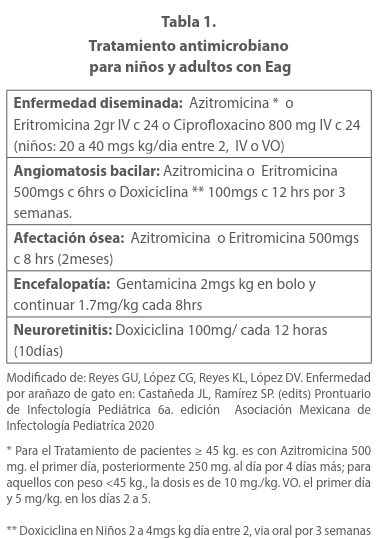 Algunos agentes eficaces son los antimicrobianos orales (claritromicina, ciprofloxacina, doxicilina, trimetoprim- sulfametoxazol, rifampicina) y gentamicina parenteral. Están indicadas en el paciente que muestren ataque a hígado y bazo u otros otros órganos, como sistema nervioso central. El tiempo de manejo se pueden resumir en 6 a 8 semanas o incluso mas tiempo en pacientes inmunocomprometidos 19. La claritromicina esta indicada sobre todo en pacientes complicados con osteomielitis u otras afecciones de órganos. Estudios realizados comparando la efectividad de Azitromicina Vs. TrImetropin-sulfametoxazol no mostraron diferencias significativas, (51.4% versus 61.5% de efectividad respectivamente), por tanto el uso de Trimetropin sulfametoxazol es un buena alternativa en tratamiento de segunda línea.20 Algunos autores recomiendan asociar rifampicina mas doxiciclina en niños mayores de 8 años, en menores de esta edad rifampicina mas azitromicina. En estos últimos la sustitución de doxiciclina por un macrólido es porque las tetraciclinas puede causar decoloración dental permanente. La neurorretinitis se suele tratar con antibióticos sistémicos y corticosteroides para reducir la inflamación del disco óptico y promover un retorno más rápido de la visión, en estos casos se prefi ere la doxicicilina. La azitromicina o la doxicilina son eficaces en el tratamiento de angiomatosis bacilar y peliosis bacilar; la terapia debe administrarse durante varios meses para prevenir recaídas en personas inmunocomprometidas. En los pacientes con fiebre prolongada y compromiso hepatoesplénico se pueden utilizar esteroides (prednisona) esto es para acortar el periodo febril, aunado al tratamiento específico. 21 Pero también tiene indicaciones en la neurorretinitis esta se suele tratar con antibióticos sistémicos y corticosteroides para reducir la inflamación del disco óptico y promover un retorno más rápido de la visión, en estos casos se prefiere la doxiciclina. En menores de 8 años se podría usar un macrólido debido a que las tetraciclinas pueden causar decoloración dental permanente. Aunque la doxiciclina no origina esta reacción secundaria. La endocarditis infecciosa asociada con abscesos hepatoesplénicos son manifestaciones raras de la enfermedad por EAG. El tratamiento prolongado con doxiciclina y gentamicina conduce a la recuperación completa. 22 Si la valoración oftalmológica muestra granulomas en la cabeza del nervio óptico y de la retina se recomienda la asociación de doxiciclina 100 más cada 24 hrs mas rifampicina que pude ser 300mgs cada 12 hrs o 600mgs c 24hrs. Entre 3 a 7 semanas de acuerdo a la evolución de los casos. 23