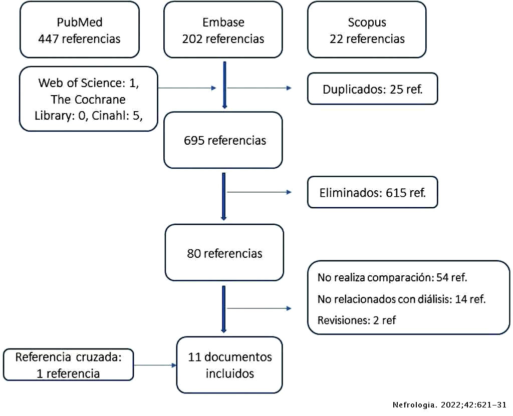 Revisión de alcance, para lo cual se consultaron diferentes bases de datos, mediante términos controlados y libres. Se incluyeron aquellos artículos que comparasen la diálisis concertada frente a la hospitalaria en términos de efectividad. Igualmente, se incluyeron aquellas publicaciones que comparasen, en el ámbito español, el coste entre ambas modalidades de prestación de servicios y las tarifas de precios públicos de las diferentes Comunidades Autónomas.