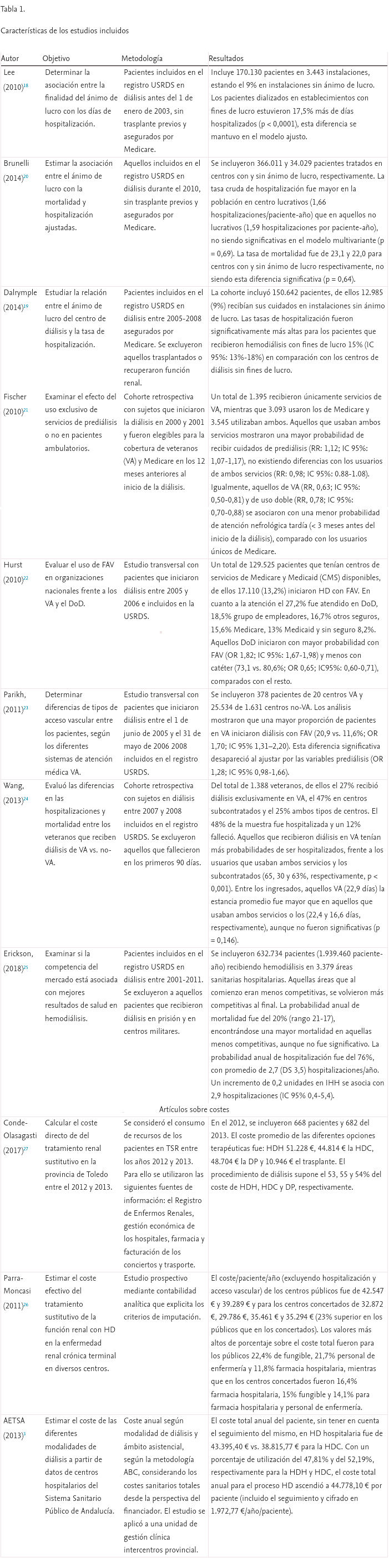 Criterios de inclusión y exclusión: se incluyeron todos los artículos que realizasen una comparación de la diálisis concertada, frente a la prestación de servicios por parte de la no concertada, en términos de resultados de efectividad, es decir, los beneficios obtenidos mediante la aplicación de un tecnología sanitaria en términos de resultados en salud (mortalidad, morbilidad, reingresos hospitalarios, etc.); las comparativas en términos de costes se limitaron a aquellos estudios realizados y publicados en España. Se excluyeron aquellas referencias a estudios en las que no se realizasen comparación entre los tipos de centros y aquellos publicados en idioma diferente al inglés o español; la búsqueda se limitó a un periodo de 10 años.