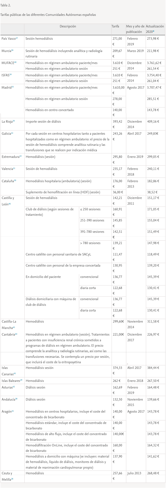 En la tabla 2 se muestran las tarifas públicas de los servicios de diálisis de las diferentes Comunidades Autónomas28–46, observándose un amplio margen temporal en las fechas de publicación de las tarifas entre junio 2011, en Castilla y León, y marzo del 2019, en Murcia. El precio público osciló entre los 393,42 € por sesión de hemodiálisis de La Rioja y 132,5 € de la sesión de hemodiálisis en Andalucía (año 2015). Además de la variabilidad entre las tarifas de las diferentes regiones, una vez actualizados los importes al 2020 mediante el índice de precios al consumo (IPC), se observa una diversidad notable en la denominación del concepto y tipo de diálisis, con un amplio rango de opciones terapéuticas que van desde la «sesión de HD» del País Vasco o Castilla y León, al detalle de cinco diferentes tipos de HD que publica Aragón.