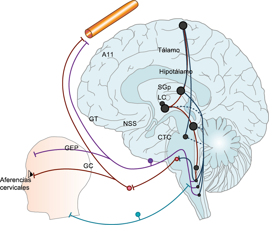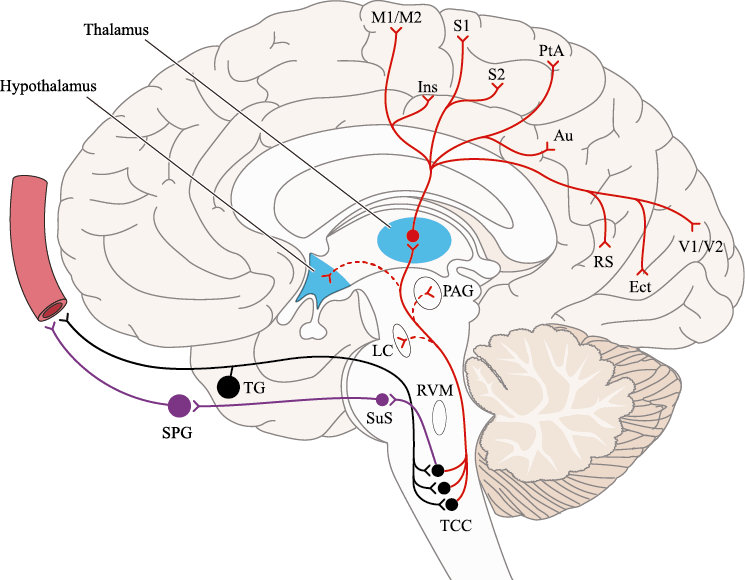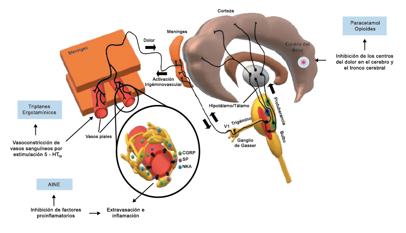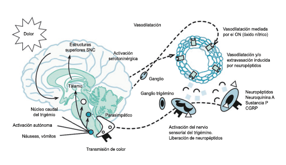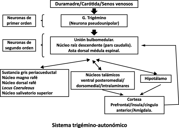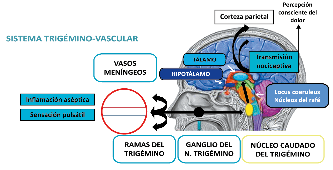 Toda la información nociceptiva de las estructuras craneovasculares se transmite a través del TCC y mediante conexiones ascendentes a otras áreas del tronco encefálico y el diencéfalo, involucradas en el procesamiento del dolor y otra información sensorial. La activación de la vía antes mencionada contribuye a la percepción del dolor durante la migraña y también a los síntomas autonómicos, endocrinos, cognitivos y afectivos que duran todo el episodio migrañoso.