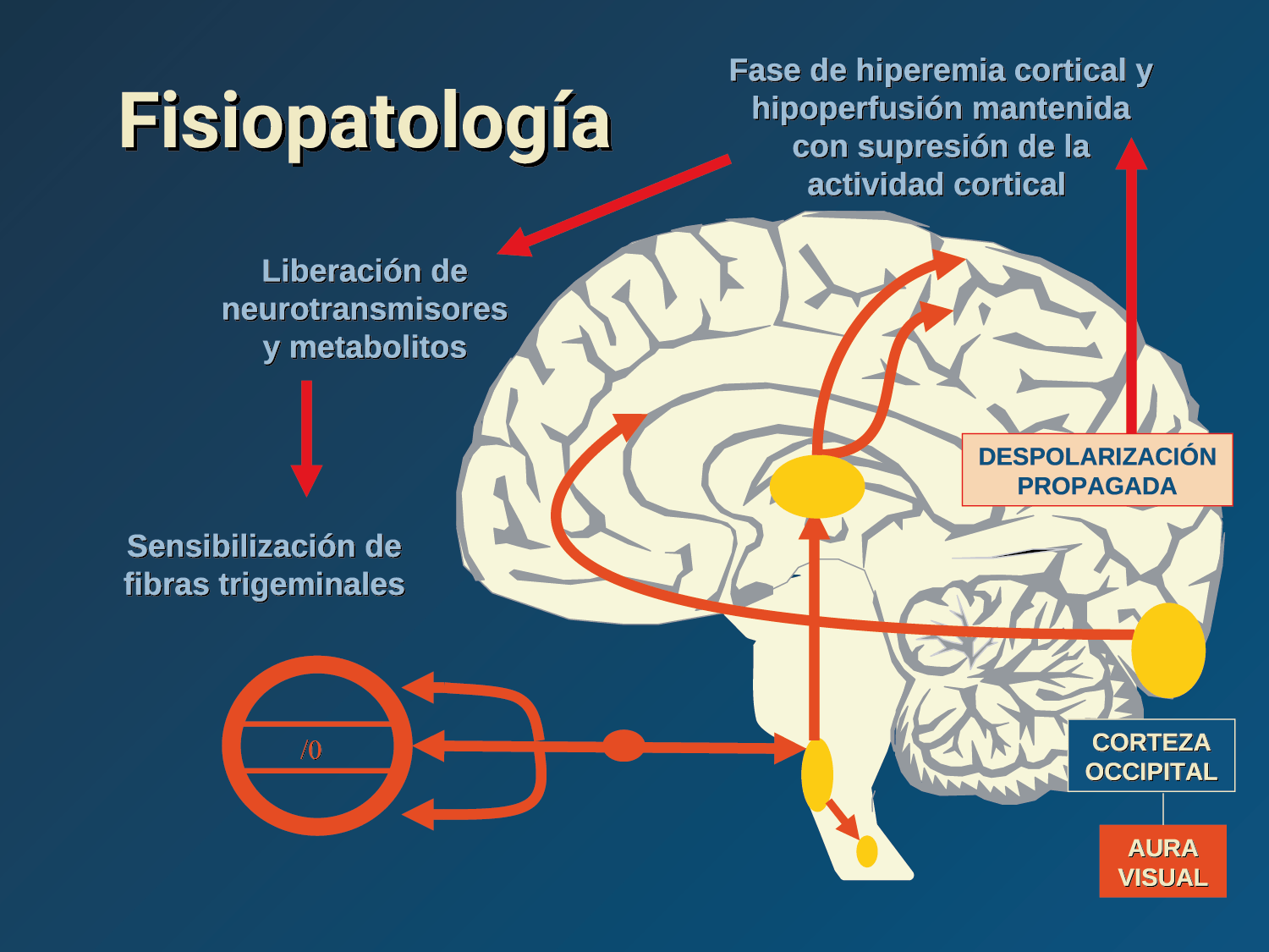 Se cree que una onda transitoria de despolarización neuronal de la corteza (Figura 9), la depresión de propagación cortical (CSD), es el mecanismo cerebral fisiopatológico subyacente al fenómeno clínico del aura de la migraña. Leão(21) estableció un mecanismo subyacente hipotético. Luego de haber estimulado eléctricamente la corteza de conejo y encontrar una depresión EEG que se propagaba a una velocidad similar de 3 mm/min centrífugamente desde el sitio de estimulación sugirió que podría ser la base del aura migrañosa. Esta hipótesis está fundamentada en la correlación entre las características neurofisiológicas de una CSD, su propagación retinotópica en la corteza visual y las características y dinámicas de los déficits visuales(14, 15) y en las observaciones indirectas derivadas de los estudios de imágenes que respaldan aún más este concepto(16) Sin embargo, sobre la base de la comprensión actual de la migraña, es poco probable que la CSD esté involucrada en el inicio del síndrome completo de la migraña(17).
