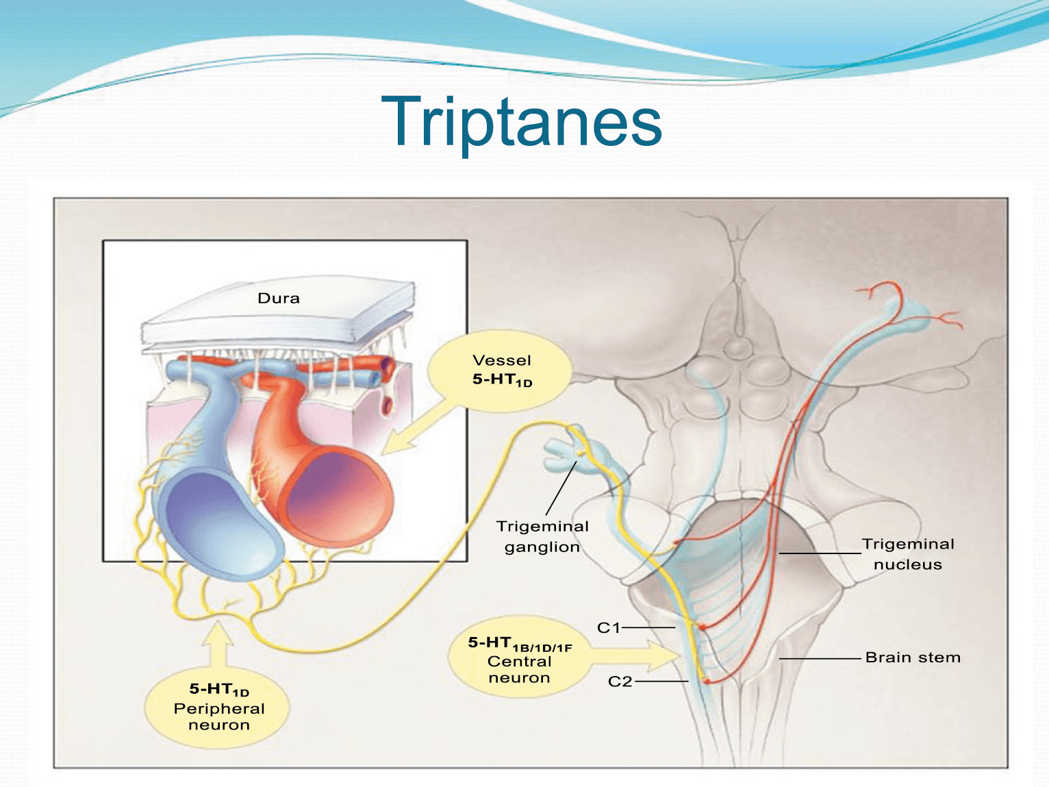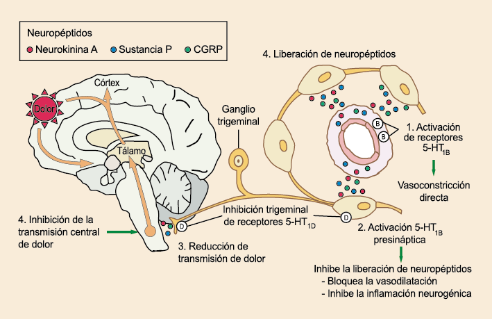 Un mecanismo neural de los triptanos en las terminaciones del nervio trigémino periférico podría inhibir la liberación de neuropéptidos proinflamatorios y la vasodilatación dural neurogénica(63), lo cual era consistente con el tema en desarrollo de la migraña como una enfermedad neurovascular. (Figuras 26 y 27)