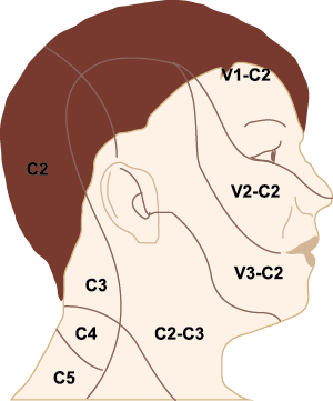 Estos datos sugieren que el núcleo del trigémino se extiende hasta el asta dorsal de la región cervical superior en un continuo funcional que incluye la extensión cervical, ello explica la distribución de la percepción del dolor en la migraña sobre las regiones frontal y temporal, además de la participación de parietal, occipital y regiones cervicales superiores(27).