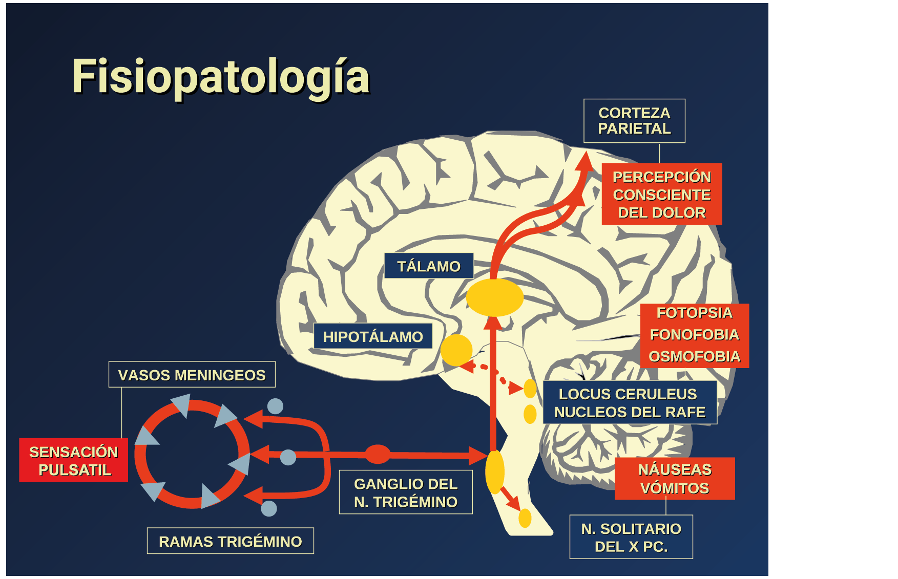 Por lo tanto, se cree que la naturaleza intensa y pulsátil del dolor en la migraña es el resultado de la activación, o la percepción de activación, de estas entradas nociceptivas de las estructuras intracraneales y extracraneales, que convergen y se transmiten a través del TCC. (Figura 17)