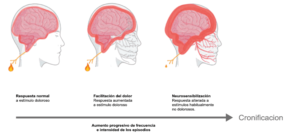 Hoy en día, la migraña se describe más comúnmente como un “trastorno neurovascular” y específicamente como un trastorno del cerebro. Una teoría que ha cobrado importancia en los últimos 15 años, que sostiene este punto de vista y ha servido para explicar muchas características de la migraña que antes no se habían explorado o simplemente no estaban claras es la “sensibilización periférica y central”. La sensibilización es una característica común de muchos trastornos de dolor crónico y se supone que también está presente durante la migraña. Es una activación y sensibilización de larga duración de los nociceptores periféricos y las neuronas nociceptivas centrales y puede explicar la longevidad del ataque de migraña y la transición hacia la migraña crónica, así como síntomas relacionados específicos(96). La sensibilización central de las neuronas trigeminovasculares ha ayudado a nuestra comprensión de la base neural de la hipersensibilidad extracraneal en la migraña, la derivación del dolor y la alodinia a las áreas faciales periorbitarias y cutáneas(97). Es probable que la sensibilización de las neuronas trigeminotalámicas explique la alodinia cutánea generalizada en las regiones extracefálicas(98).