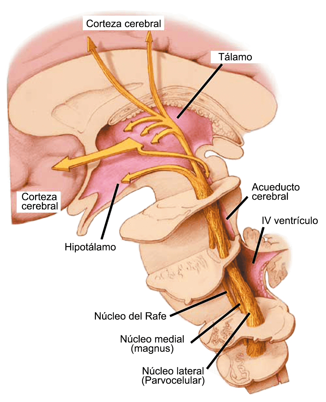 Muchos pacientes también describen la privación del sueño o el sueño interrumpido o reducido continuamente, como un posible desencadenante de la migraña(50). La regulación del sueño, particularmente dentro del hipotálamo, está fuertemente ligada al desencadenamiento de la migraña. Los núcleos del mesencéfalo están involucrados al desencadenamiento de la migraña, además de contribuir a los síntomas asociados a través de proyecciones al hipotálamo y otros núcleos del tronco encefálico y diencefálico. Además de controlar la modulación del dolor, las cé- lulas “ON: ENCENDIDAS” y “Off: APAGADAS” en RVM (médula medial rostro-ventral) y NRM (nú- cleos del rafe magno) (Figura 21).