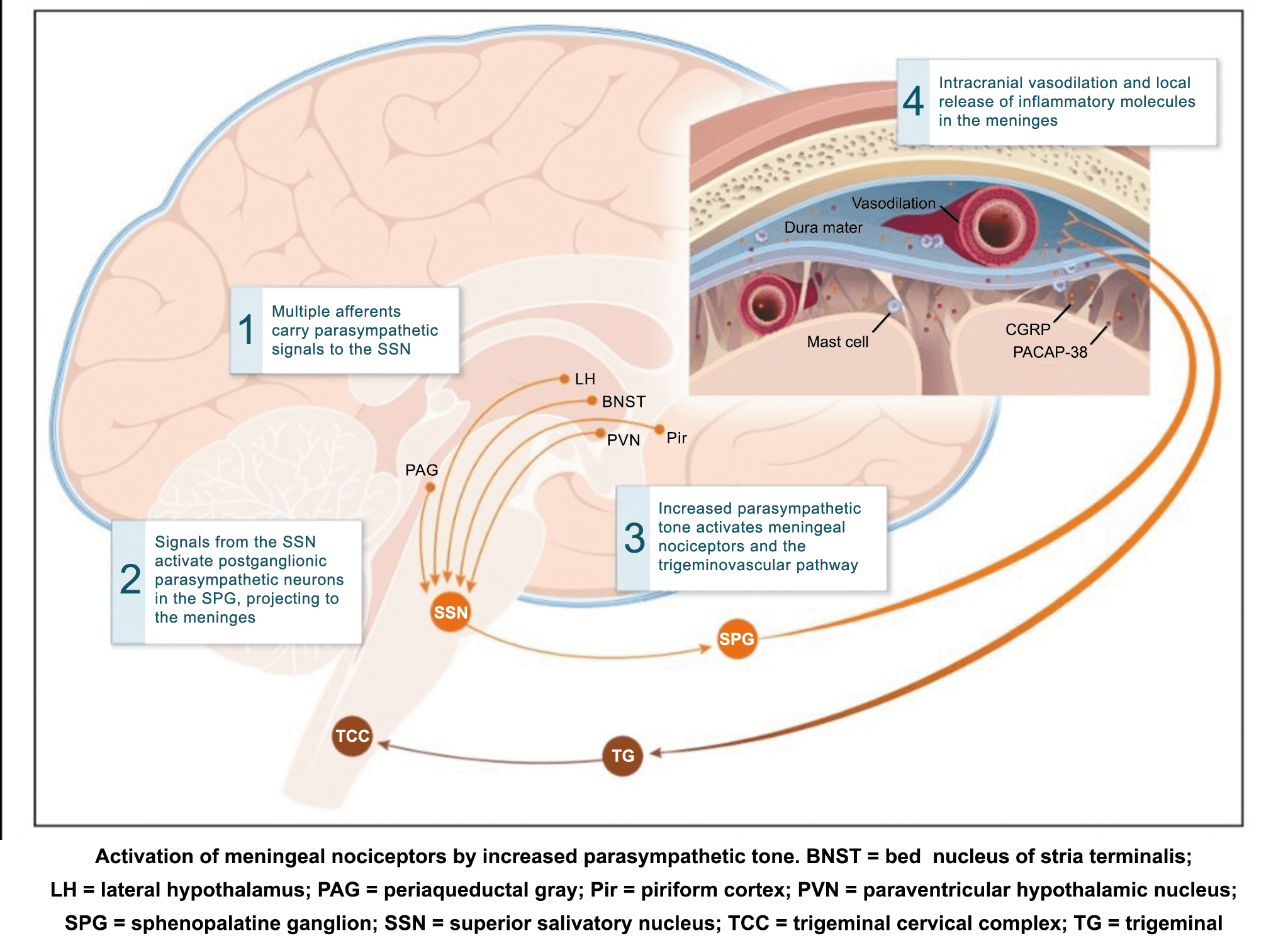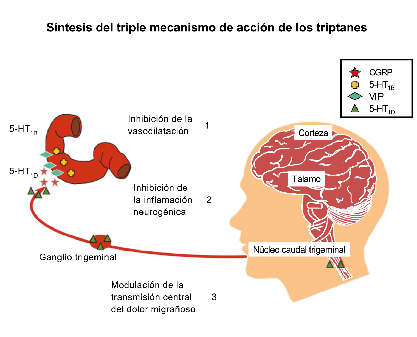 El CGRP está ampliamente distribuido, incluso en el cuerpo estriado, la amígdala, el hipotálamo, el tálamo, el tronco encefálico y el TCC(69). Dentro de las vías trigeminovasculares aferentes primarias, la expresión de CGRP es más alta en el ganglio del trigémino sensorial y sus proyecciones de fibras Aδ y C a los vasos sanguíneos cerebrales y durales, así como centralmente a la médula espinal(70), donde puede afectar proyecciones ascendentes de segundo orden. Se han identificado receptores de CGRP funcionales y sitios de unión en las células del músculo liso de la arteria dural y en los ganglios del trigémino, el tálamo, el hipotálamo, la amígdala, la corteza y el tronco encefálico(71).