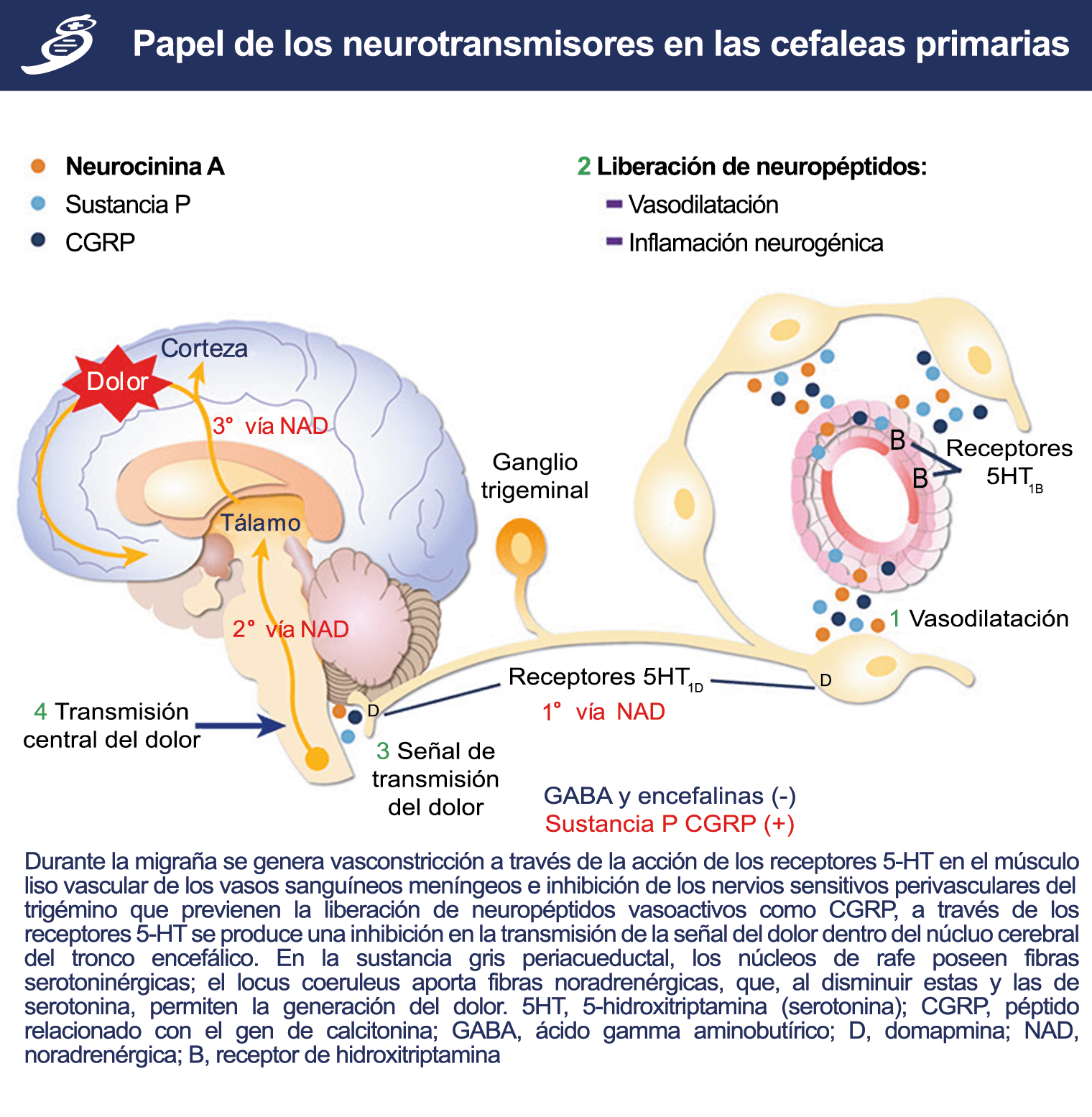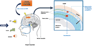 La activación del sistema trigeminovascular da como resultado la liberación de varios neuropéptidos basados en las inervaciones simpática, parasimpática y sensorial de la vasculatura craneal, que se resumen en la figura 23.