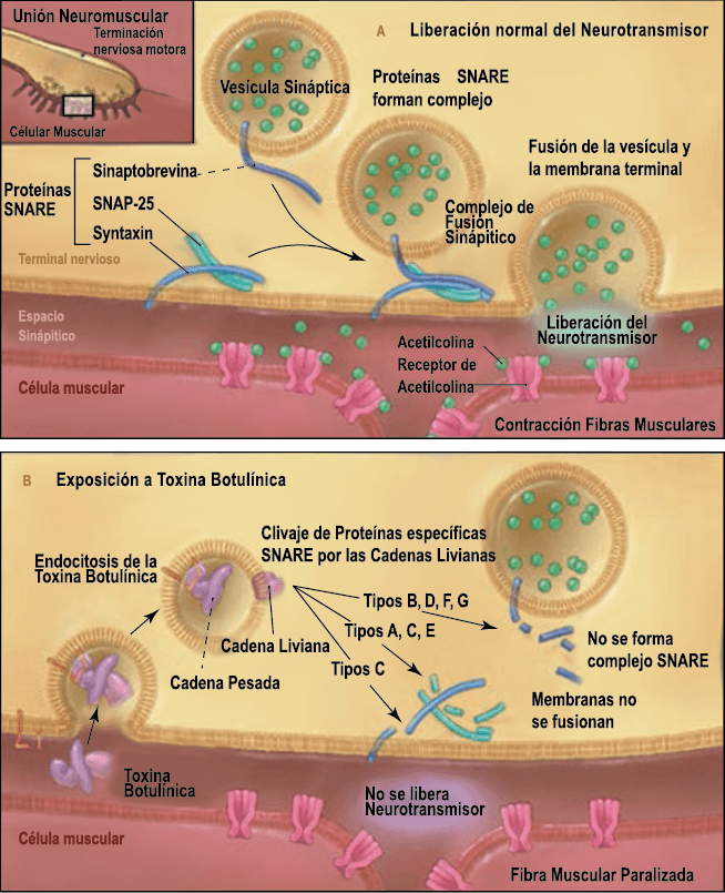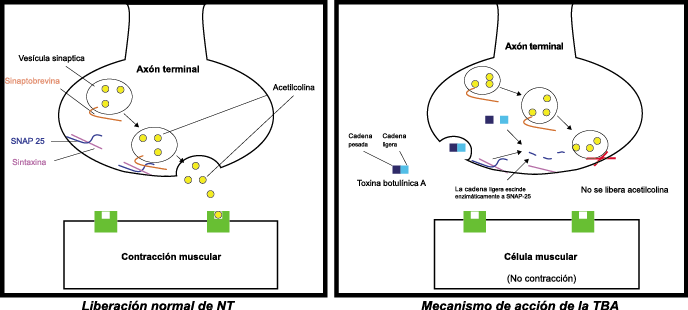 La toxina botulínica tipo A (BT-A) fue descrita por primera vez por Binder y colaboradores en 1991 como tratamiento preventivo para la migraña al observar que cuando pretendían reducir líneas de expresión faciales en algunos pacientes estos vieron como también se redujeron los dolores de cabeza por migrañas. La BT-A ya ha sido utilizada previamente como tratamiento de otras afecciones tales como hiperhidrosis axilar, estrabismo, acalasia o alteraciones musculares como distonías y espasticidad. La inyección vía subcutánea de toxina botulínica tipo A (BT-A) en el cuero cabelludo, fue aprobada en 2011 por la FDA. Diversos estudios in vitro e in vivo han demostrado que la TBA inhibe la liberación de la sustancia P y de aminoácidos excitadores y péptido relacionado con el gen de la calcitonina) (Figura 29). Más recientemente, su efecto antinociceptivo ha sido relacionado con inhibición de liberación de glutamato (Figura 30).