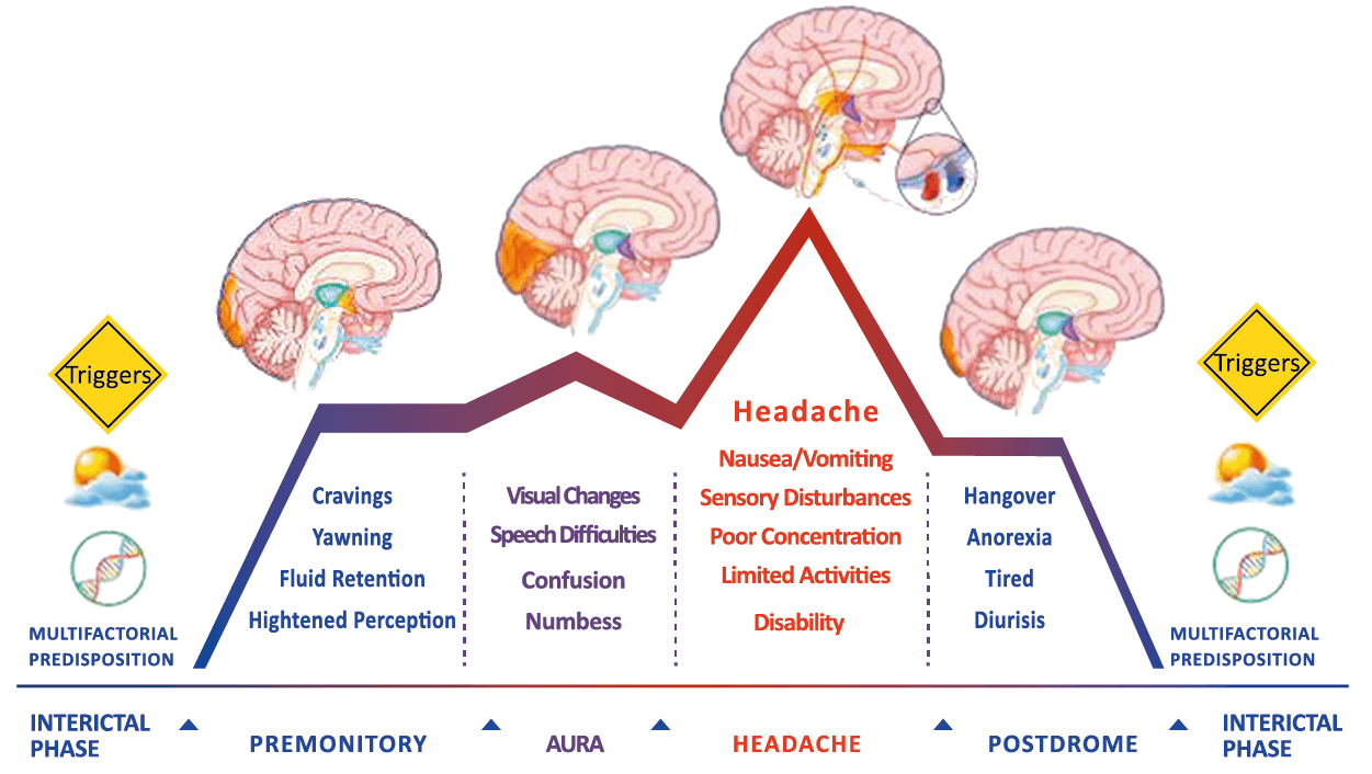 Siendo un trastorno cerebral complejo y multifacético que en su totalidad puede durar varios días, se ha dividido clásicamente en cuatro fases: premonitoria, aura, cefalea y postdrómica. Estos pueden ocurrir en un orden secuencial lineal, pero en la mayoría de los casos, las fases de la migraña muestran una significativa superposición, de modo que el orden lineal es a la vez atractivo y engañoso en su simplicidad. Es importante recalcar que algunos síntomas, como el cansancio o el deterioro de la concentración, bien pueden presentarse en todas las fases. En realidad, solo el dolor de cabeza, por su ausencia o presencia, es quien se destaca, aunque, como se verá, es solo parte del cortejo sintomático.