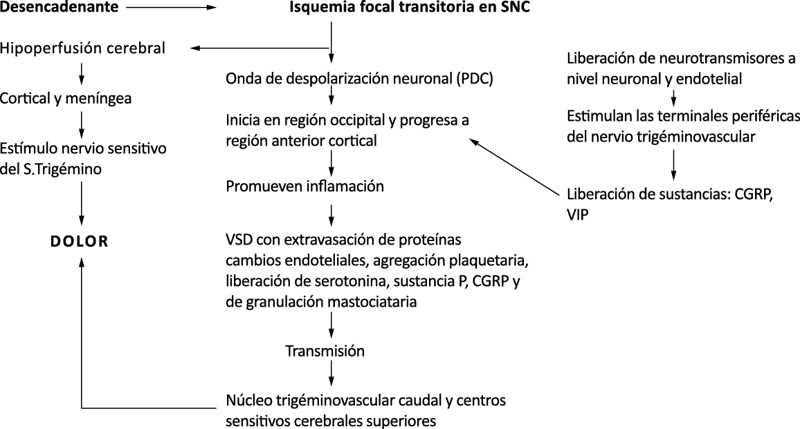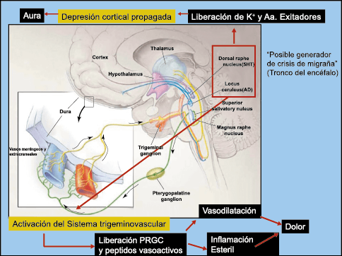 Teniendo en cuenta uno de los efectos iniciadores de la migraña, como la depresión cortical propagada, que probablemente es causada por una alteración de la permeabilidad neuronal y tiene una disfunción posterior de canales iónicos, es importante recalcar la presencia de dos mecanismos neuronales subyacentes: la sensibilización periférica y la sensibilización central(85). Las estructuras sensitivas intracraneanas reciben inervación de ramas del trigémino estimuladas por liberación neuronal y endotelial, abriendo receptores en las terminales neurogénicas. Esto lleva al incremento de la concentración de calcio intracelular, seguido de fosforilación y activación de proteincinasa (PKC) y tirosincinasa (TryK) que, a su vez, por mecanismos moleculares aumenta la liberación de sustancias como la CGRP y VIP y promueve la inflamación neurogénica. Este proceso conduce a la sensibilización periférica dada por la disminución del umbral de respuesta de las fibras meníngeas, potenciándose el dolor y la inflamación(86). Por otra parte Las concentraciones de serotonina, la cual se forma a partir del L-triptófano, son altas en las plaquetas y en el tracto gastrointestinal. Este hecho adquiere crucial importancia ya que la serotonina viaja por el torrente sanguíneo hasta el cerebro donde sufre procesos de hidroxilación y descarboxilación para realizar sus funciones a nivel central(22). Las neuronas ricas en esta sustancia se encuentran alrededor del tallo cerebral y de la formación reticular en especial en el núcleo caudalis del trigémino en donde no solo donde tienen la mayor concentración de serotonina, también estas neuronas predominantemente serotoninérgicas se encuentran en mayor concentración, lo cual es un factor especial para desencadenar el proceso de activación del sistema trigémino vascular en el ataque de migraña. Los receptores especiales de 5HT, al activarse, incrementan la hidrólisis de inositol fosfato y generan un aumento de la concentración de calcio en el proceso migrañoso. Además de la serotonina existen diferentes sustancias involucradas en el desarrollo de la cefalea como los receptores dopaminérgicos y la histamina, que tienen efectos vasculares de vasoconstricción o vasodilatación. Existe una hipersensibilidad dopaminérgica en la migraña y en lo que respecta a la histamina, se ha visto incrementada a nivel plasmático por una posible liberación a partir de los leucocitos o por la activación de células mastocitarias. Aunque la histamina no cruza la barrera hematoencefálica esta actúa a través de receptores H1 que están en el endotelio(88).