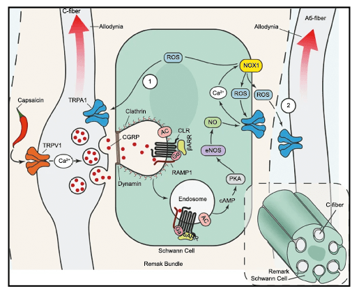 El CGRP (Péptido relacionado con el gel de la calcitonina) es un neuropéptido de 37 aminoácidos con potentes efectos vasodilatadores que se produce mediante empalme alternativo del gen de la calcitonina. Con respecto al sistema nervioso, αCGRP se expresa predominantemente, mientras que βCGRP se asocia con el sistema sensorial entérico(64). El CGRP actúa en dos receptores: uno, el llamado complejo canónico de CGRPreceptor, está formado por un receptor acoplado a proteína G y un único receptor transmembrana que modifica proteína (RAMP) 1(65).