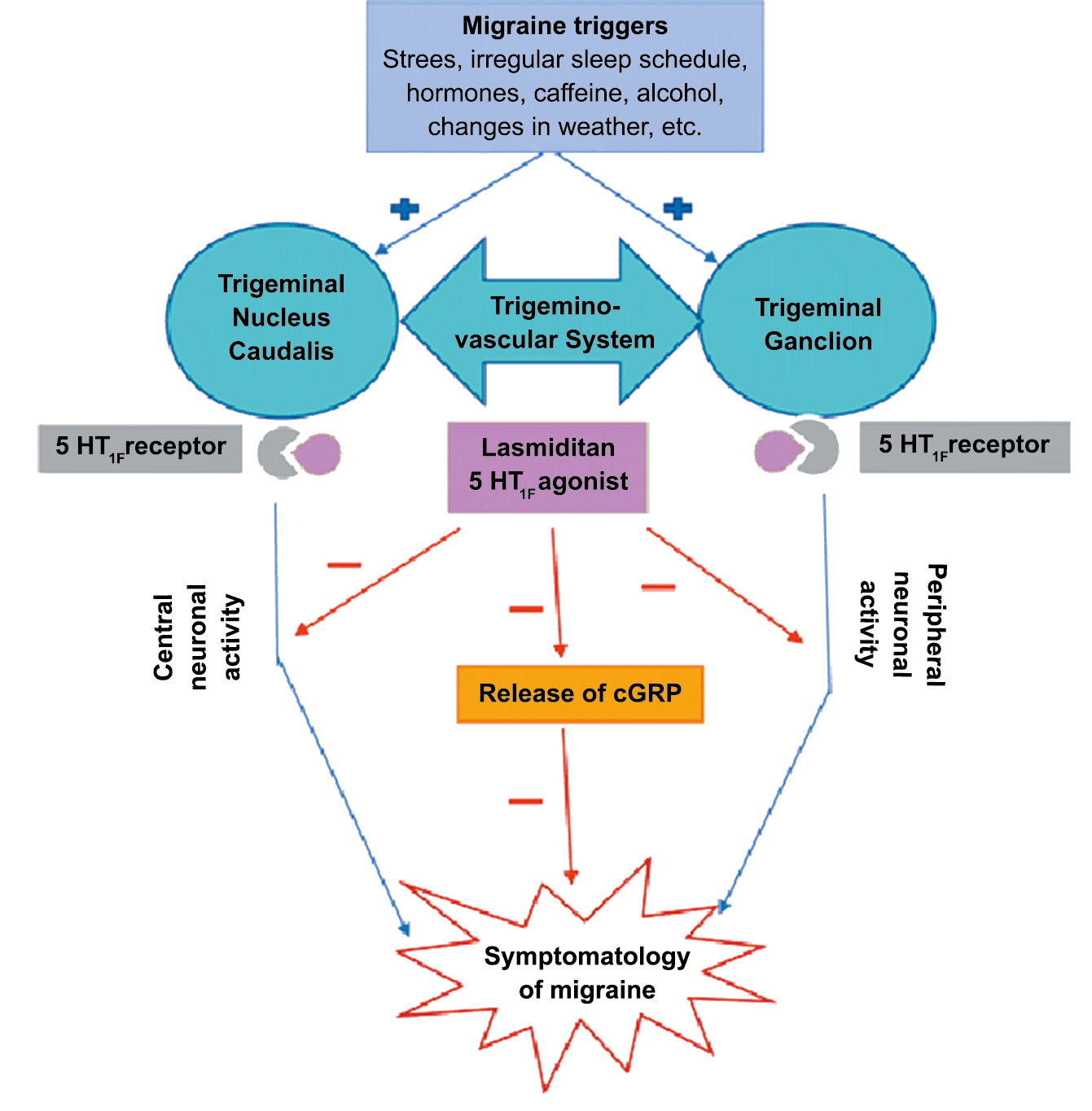 La comprensión de la biología de la migraña a través de una cuidadosa investigación de laboratorio ha llevado al desarrollo de las principales clases de tratamientos: triptanos, agonistas del receptor de serotonina 5-HT1B/1D; gepants, antagonistas del receptor del péptido relacionado con el gen de la calcitonina (CGRP); ditanes, agonistas del receptor 5-HT1F, CGRP anticuerpos monoclonales; moduladores de mGlu5, sin olvidar el efecto ya demostrado por parte de los bloqueantes de los canales de calcio (flunarizina) y de los neuromoduladores; bien se trate de topiramato (Inhibe la acción de la anhidrasa carbónica, bloquea los canales del sodio, aumenta las corrientes de cloro mediadas por GABA, activa las corrientes hiperpolarizantes del K+ e inhibe la activación de receptores a ácido glutámico tipo AMPA), valproato de sodio (Inhibe las enzimas de degradación del GABA y puede aumentar su síntesis, además de tener un papel inhibidor de la transmisión excitatoria de ciertos aminoácidos, entre ellos el glutámico y reducir el umbral de conductancia del calcio y el potasio) y de los antidepresivos de diversas clases como la amitriptilina (antidepresivo tricíclico que impide la recaptación y la inactivación de la noradrenalina y la serotonina en las terminaciones nerviosas) y venlafaxina (inhibe principalmente la recaptación de serotonina y en menor grado de noradrenalina, en la membrana presináptica neuronal, potenciando la neurotransmisión a nivel del sistema nervioso central). El propanolol tiene un efecto antagonista de los adrenoceptores β1 en las neuronas del núcleo VPM (postero medial ventral) del tálamo que responden a la entrada nociceptiva trigeminovascular. Se ha demostrado que el propanolol previene los cambios en el comportamiento y el flujo sanguíneo cerebral inducido por la depresión cortical propagada, además de bloquear los canales de sodio del cerebro(103), modulación del sistema catecolaminérgico central(104) probablemente a través de receptores β-adrenérgicos centrales e interacción cruzada con receptores de serotonina(105) (Figura 4).