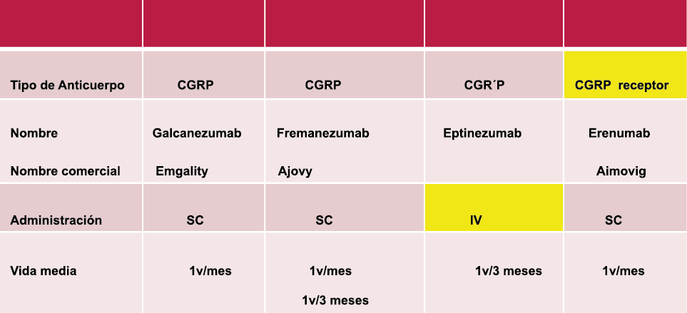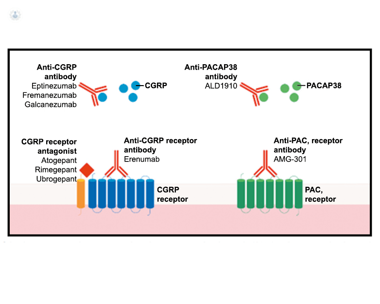 Los anticuerpos monoclonales contra el péptido CGRP y el receptor (numab y nezumabs) se han desarrollado para capitalizar los efectos antimigrañosos comprobados del bloqueo de los mecanismos CGRP como nuevos tratamientos preventivos. Los anticuerpos contra el péptido CGRP, al CGRP y del receptor CGRP (complejo CLR/RAMP1) han presentado datos positivos de ensayos controlados.(83) (Figura 36 y Tabla 3)