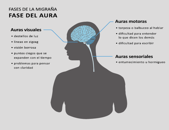 En la primera fase (figura 3), premonitoria, que precede a la cefalea, los sistemas del tronco encefálico y diencefálico modulan las señales aferentes, la fotofobia a la luz o la fonofobia al sonido, comienzan a disfuncionalizarse y eventualmente a evolucionar a la fase de dolor y con el tiempo a la fase de resolución o posdrómica. Aproximadamente en un tercio de los pacientes con migraña, sus ataques están asociados con déficits neurológicos, que incluyen perturbaciones corticales, denominadas colectivamente aura de migraña(3).