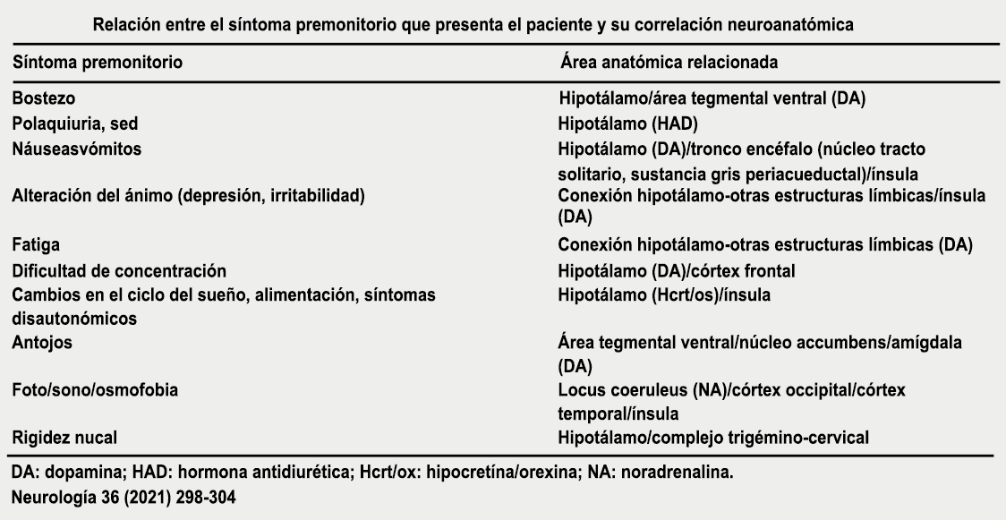Los síntomas premonitorios son parte del cuadro clínico que acompaña a los dolores de cabeza en las crisis de migraña. Por definición, ocurren antes del inicio del dolor y son diferentes del aura de la migraña. Los síntomas premonitorios más frecuentemente reportados fueron sensación de cansancio y agotamiento (72%), problemas de concentración (51%) y rigidez de nuca (50%). Menos comunes, pero de manera importante, asociados con una mayor previsibilidad de los ataques de migraña fueron los bostezos, la visión borrosa, la sensibilidad al ruido, las dificultades de la función cortical superior (como leer, escribir, hablar, pensar) y sentirse emocional e irritable. Además, la regulación homeostática parece estar alterada durante la fase premonitoria que se manifiesta con sed, náuseas, hambre, micción frecuente o estreñimiento(36). Este patrón complejo de síntomas ha llevado a la hipótesis de que los síntomas podrían ser de naturaleza hipotalámica y/o cerebrales difusos(37). La mayoría de los migrañosos los experimentan mucho antes de que se inicie la típica migraña, pero que ya le indican al paciente que un dolor de cabeza está en camino. Estas señales premonitorias pueden preceder a la fase de dolor de cabeza hasta 72 horas, también se han informado cambios en el estado de ánimo y la actividad, irritabilidad, fatiga, antojos de alimentos, bostezos repetitivos, rigidez en el cuello y fonofobia. Pueden perdurar hasta bien entrada el aura, la cefalea e incluso las fases posdrómicas. La consistencia de estos síntomas permite a algunos migrañosos predecir de forma fiable sus crisis dolorosas. El hecho de que estos síntomas sean en gran medida de origen hipotalámico, han sido demostrados por estudios de imagen mediante PET con H2O(12).