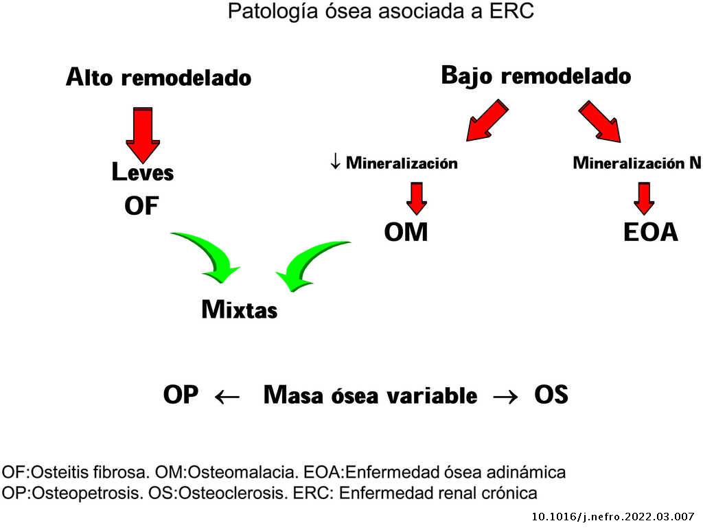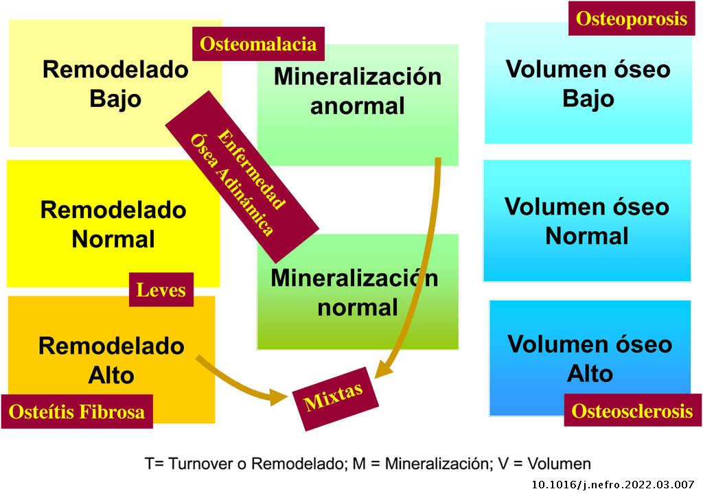 Osteodistrofia renal ha sido un término empleado tradicionalmente para referirse a las alteraciones del metabolismo óseo-mineral de los pacientes con enfermedad renal crónica (ERC). La fundación Kidney Disease: Improving Global Outcomes (KDIGO) propuso nuevas definiciones y un sistema de clasificación más integrado, relegando el término tradicional de osteodistrofia renal1–5.