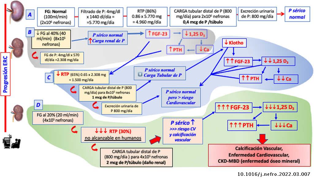 Lasdiferentes alteraciones metabólicas son secundarias a la pérdida progresiva de masa y/o función renal (capacidad depurativa). El riñón es esencial en la homeostasis mineral por ser fuente de alguna de sus moléculas reguladoras (klotho, calcitriol) y al mismo tiempo órgano diana, siendo el principal regulador del balance del fosfato del organismo. Esto justifica que el deterioro progresivo de la homeostasis fosfocálcica y su regulación endocrina se inicie en los primeros estadios de la ERC.